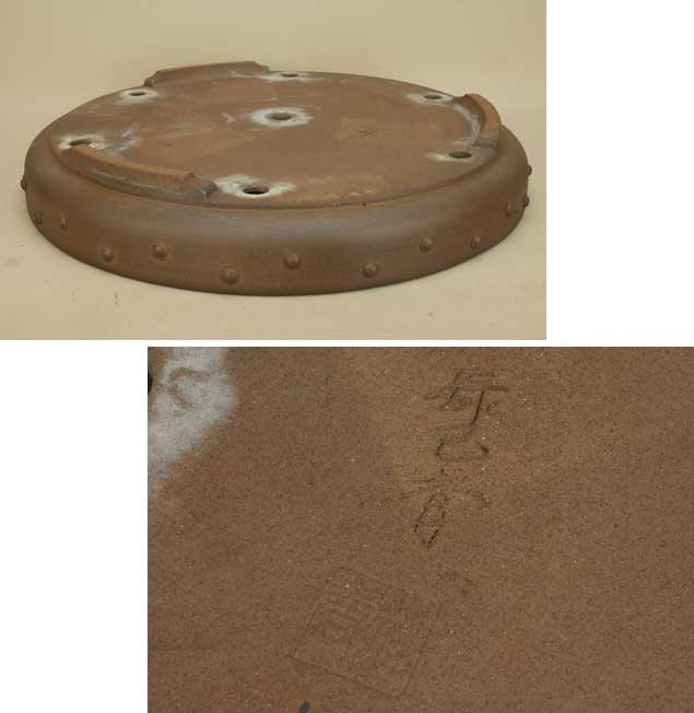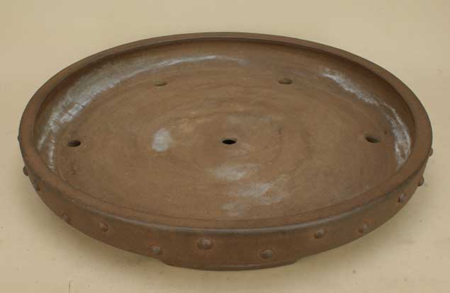 送料無料【盆栽鉢】 時代鉢 春松陶印緑己斉作 紫泥鋲打丸鉢(無傷)【大型サイズ】【径:46cm 高:7.3cm】