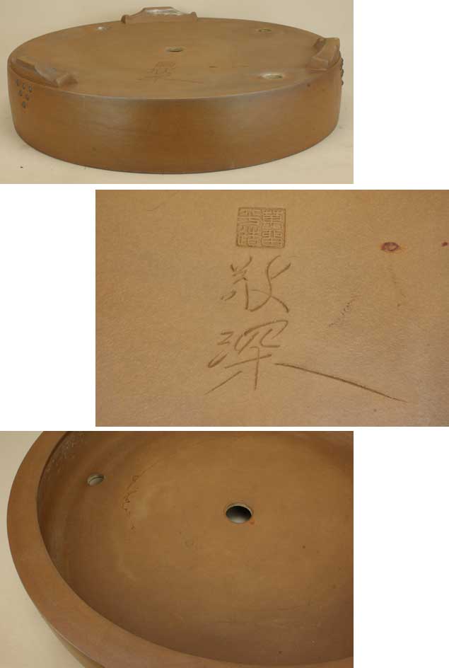 送料無料【盆栽鉢】 時代鉢 萬留平 敬深作 桃花泥 鋲打 丸鉢(無傷)【大型サイズ】【口径:48cm 高:10.5cm】