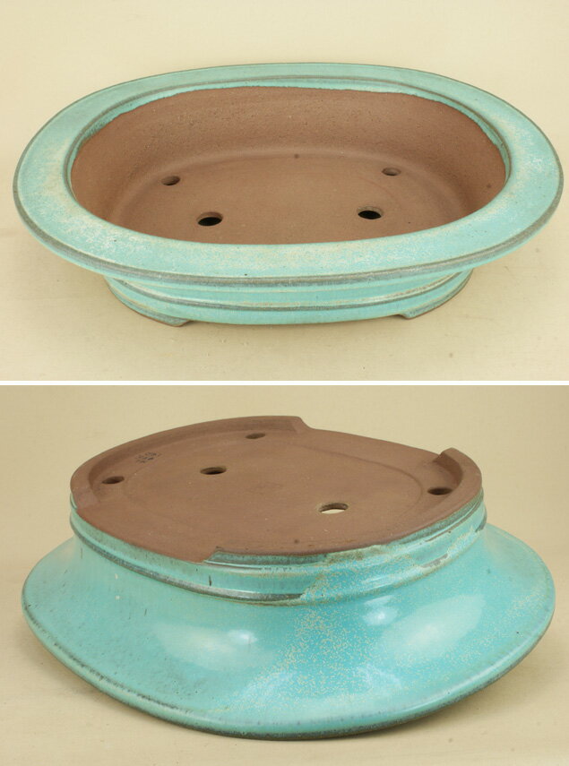 【盆栽鉢】 時代鉢 角山作 織部釉外縁楕円鉢 (無傷)(大型サイズ 左右:43.7cm) 日本における盆栽の小型化と経済の低迷により、盆栽鉢の生産が激減する中、昭和の時代に生産された日本鉢のすばらしさが見直され、海外からの需要が急激に高まっています。