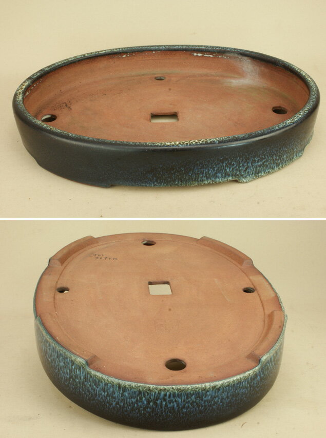 送料無料【盆栽鉢】 時代鉢 黄蘭窯造 海鼠釉切立楕円鉢 (無傷)(大型サイズ 左右:42cm) 【いよじ園 伊予路園】