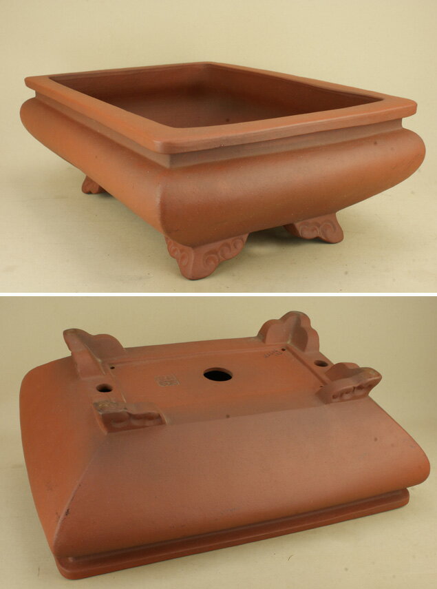 【盆栽鉢】 時代鉢 銭号作 朱泥袋式外縁長方鉢 (無傷)(大型サイズ 左右:48cm) 日本における盆栽の小型化と経済の低迷により、盆栽鉢の生産が激減する中、昭和の時代に生産された日本鉢のすばらしさが見直され、海外からの需要が急激に高まっています。